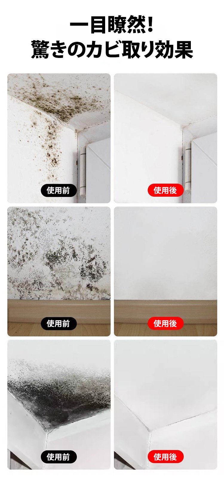 スプレーして1~3分待つだけで、カビのシミが自動的に白くなり、分解されます! 優しく拭き取るだけで壁がリフレッシュ。面倒なすすぎは不要です。10年ものの黒カビも瞬時に除去できます!